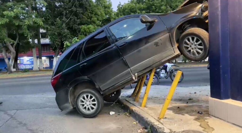 Poza Rica, Ver., 5 de septiembre de 2025 — Un accidente vehicular se registró la mañana de este viernes en el cruce del bulevar Adolfo Ruiz Cortines y la calle Naranjos, en la colonia Chapultepec, cuando una camioneta Buick de color negro, con placas YJG-027-A del estado de Veracruz, terminó sobre los tubos de contención instalados en la zona.
