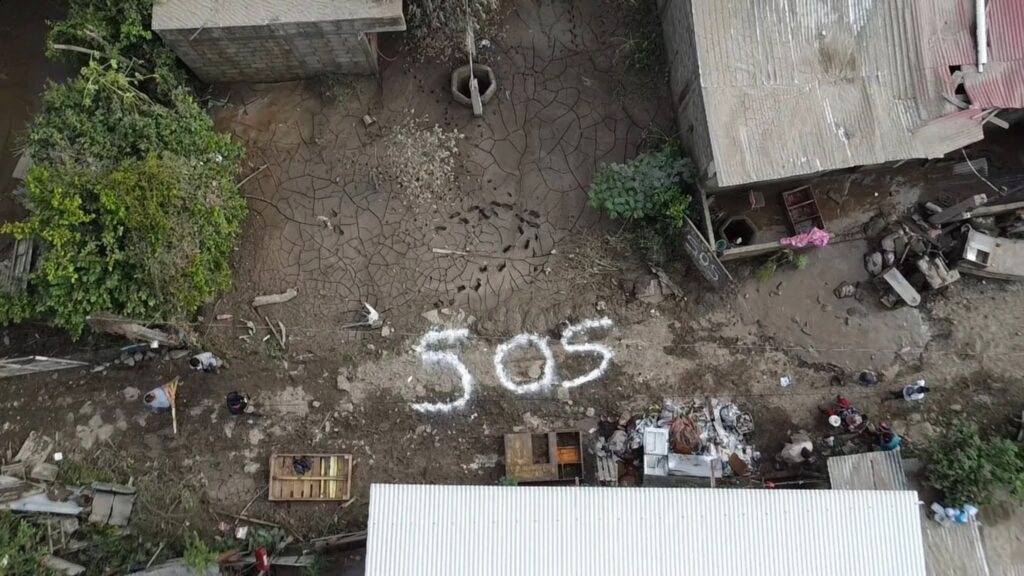 Desde el aire, el mensaje “SOS” no solo pide ayuda: denuncia el abandono. Es el eco de una población que se aferra a la esperanza en medio del desastre, que levanta la voz con cal, barro y dignidad.