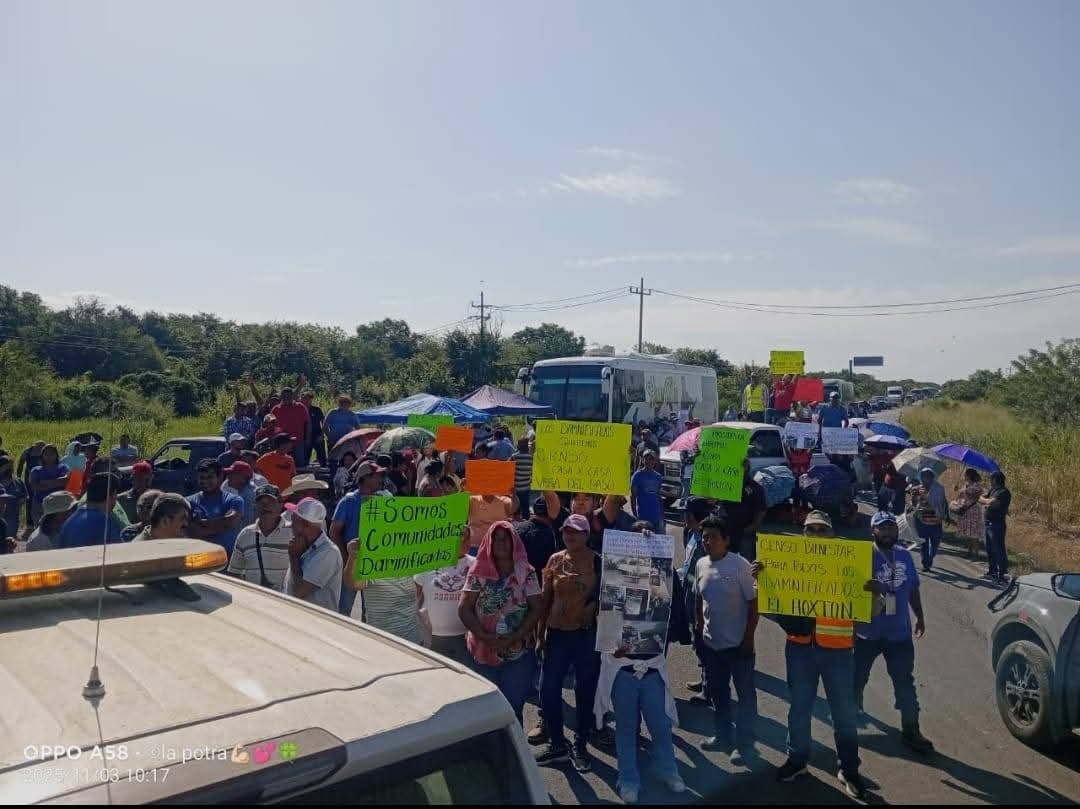 Con pancartas y bajo el sol ardiente, los manifestantes denunciaron que la Secretaría de Bienestar dejó fuera a cientos de hogares, principalmente en comunidades como Badeas, Emiliano Zapata, El Hoxton, El Cuve, Vega del Paso y El Pueblito, donde el agua arrasó con viviendas, cosechas y pertenencias.