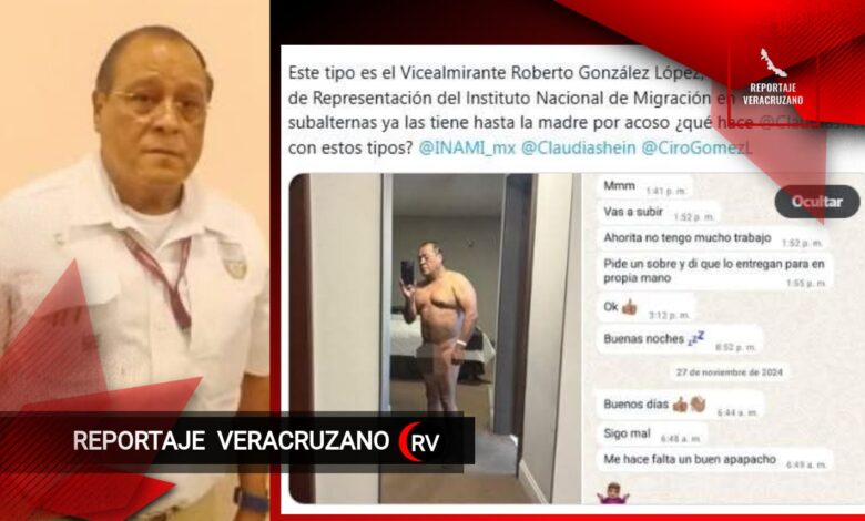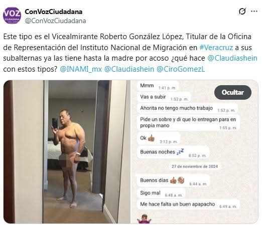 “Este tipo es el Vicealmirante Roberto González López, titular del INM en Veracruz. A sus subalternas ya las tiene hasta la madre por acoso. ¿Qué hace @Claudiashein con estos tipos?”.