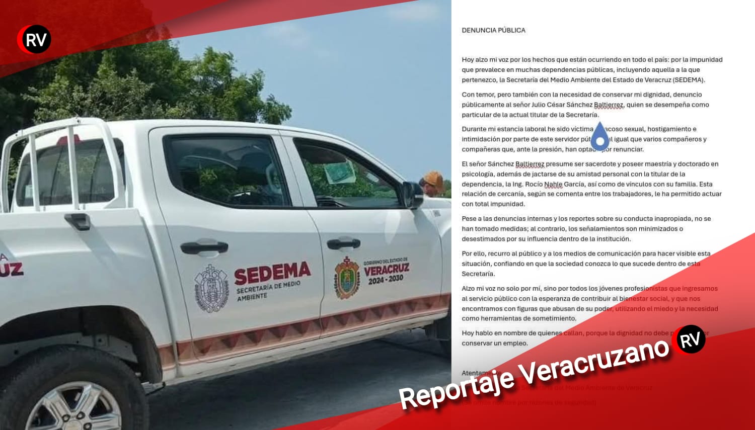 Veracruz, Ver. — La Secretaría de Medio Ambiente del Gobierno de Veracruz (SEDEMA) enfrenta un nuevo y delicado escándalo interno que amenaza con poner en evidencia las grietas morales y administrativas del gabinete estatal. Trabajadores de la dependencia denunciaron —a través de una carta abierta enviada a diversos medios— el presunto acoso sexual, hostigamiento laboral y abuso de poder perpetrado por Faustino Sánchez Baltierrez, actual secretario particular de la titular de la SEDEMA.