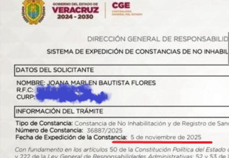 Resulta indispensable observar que el gobierno de Rocío Nahle avaló la expedición de la constancia de no inhabilitación —con fecha del 5 de noviembre de 2025 según versiones— posterior a la difusión de notas informativas desde la mañana del 3 de noviembre que señalaban el caso. Esta temporalidad crítica deja entrever al menos dos hipótesis que demandan ser aclaradas: