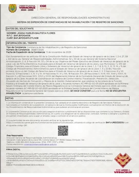• Solicitar vía transparencia la constancia original del 5 de noviembre de 2025 que se dice expidió el gobierno estatal, junto con el oficio que la facultó, y cotejarla con el registro del Sistema Nacional Anticorrupción sobre la inhabilitación de Bautista.