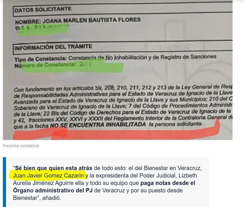 • Ella misma afirmó en medios que “no estoy inhabilitada” y denunció una “campaña negra” en su contra, responsabilizando por ello al delegado de la Secretaría del Bienestar en Veracruz, Juan Javier Gómez Cazarín, así como a la magistrada Lizbeth Aurelia Jiménez Aguirre.