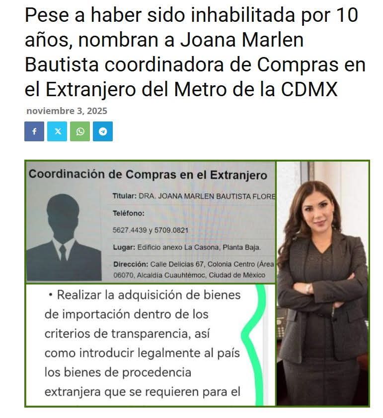 El silencio del poder se vuelve estruendo cuando se contrapenan hechos que demandan explicación pública. En ese sentido, el reciente nombramiento de Joana Marlén Bautista Flores en el Sistema de Transporte Colectivo Metro de la Ciudad de México (STC Metro), sumado a una constancia de no inhabilitación cuya fecha y contexto resultan polémicos, apuntan a un posible quiebre en el imperativo institucional de transparencia y rendición de cuentas.