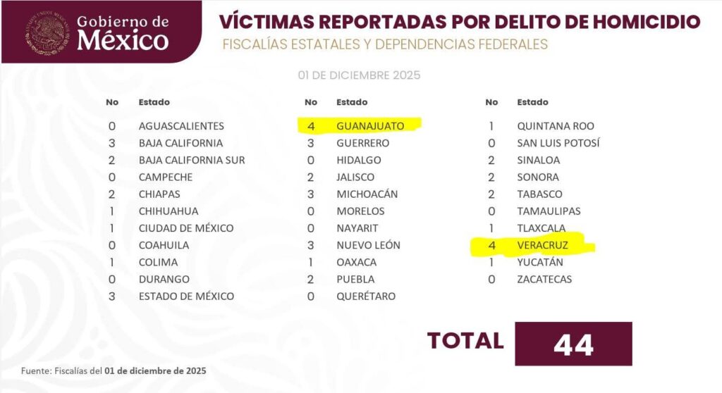Xalapa, Ver. — La imagen oficial que circula en redes y que acompaña el reporte diario del Gobierno federal no deja lugar a dudas: al 1 de diciembre de 2025 Veracruz aparece, junto con Guanajuato, entre las entidades con más víctimas de homicidio reportadas ese día —4 casos—, según el tablero estatal-federal que resume las carpetas abiertas por las fiscalías. Este dato puntual choca de frente con la narrativa del primer informe de la gobernadora Rocío Nahle, que proclamó públicamente que Veracruz es “la octava entidad más segura del país” tras una reducción porcentual en la incidencia delictiva.