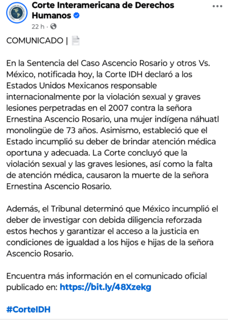 La Corte Interamericana de Derechos Humanos (Corte IDH) emitió una sentencia histórica y demoledora: el Estado mexicano es responsable internacionalmente por la violación sexual, tortura, falta de atención médica y muerte de Ernestina Ascencio Rosario, mujer indígena náhuatl monolingüe de 73 años, ocurrida en febrero de 2007 en la Sierra de Zongolica, Veracruz. No fue un “malentendido”, no fue una “muerte natural”, no fue un “caso cerrado”: fue un crimen de Estado.