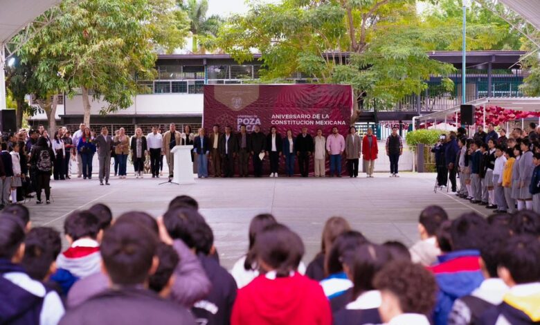 Poza Rica, Ver.— La presidenta municipal de Poza Rica, Adanely Rodríguez, encabezó el acto cívico conmemorativo del 109 aniversario de la promulgación de la Constitución Política de los Estados Unidos Mexicanos de 1917, acompañada por el director de la Escuela Secundaria General No. 1 “Heriberto Jara Corona”, Maximiliano Montano Martínez, integrantes del cuerpo edilicio, autoridades educativas y ciudadanía en general.
