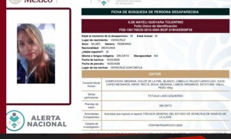 De acuerdo con la ficha técnica difundida por la CNB, la primera persona responde al nombre de Ilse Nayelli Guevara Tolentino, de 35 años de edad. Fue vista por última vez el pasado 16 de marzo; entre sus señas particulares destaca una estatura de 1.56 metros, tez blanca, cabello largo liso en tono rojizo y un tatuaje visible en el costado izquierdo.