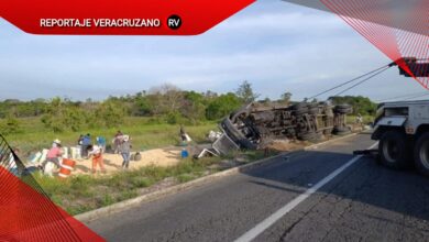 Se vuelca camión cargado con maíz en la súpercarretera Las Choapas–Ocozocuautla; pobladores aprovechan el siniestro