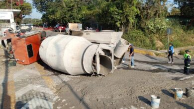 VOLCADURA DE REVOLVEDORA EN LA CÓRDOBA–AMATLÁN: PESADA UNIDAD QUEDA ATRAVESADA EN LA VIALIDAD, SIN LESIONADOS